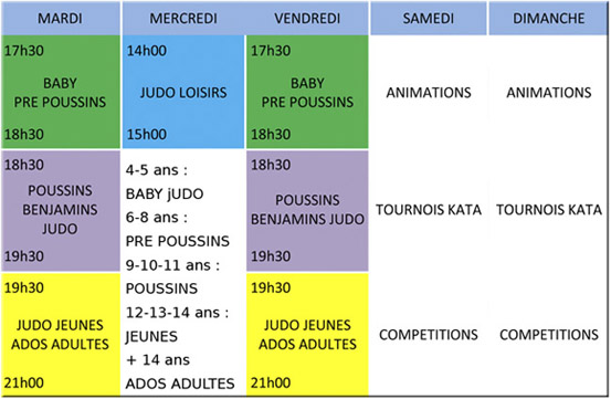 | Judo Enfants ados et adultes | Parce que l'enseignement de judo n'est pas le même à 8 ans, 12 ans, 17 ans et plus, le club a développé une pédagogie adaptée. A chaque âge son cours. |