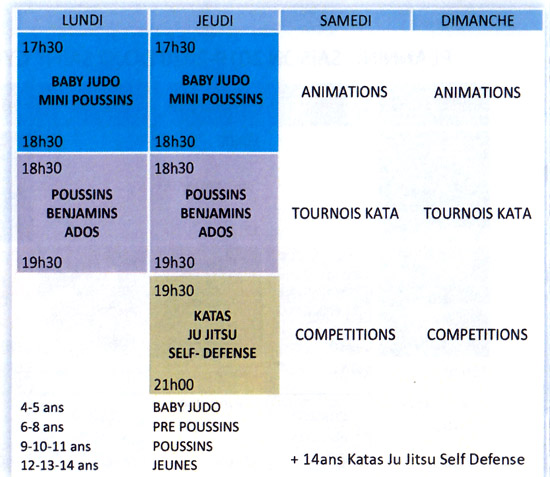 | Judo Enfants ados et adultes | Parce que l'enseignement de judo n'est pas le même à 8 ans, 12 ans, 17 ans et plus, le club a développé une pédagogie adaptée. A chaque âge son cours. |